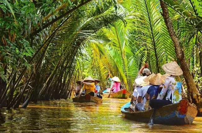 Por la tarde, el barco se traslada a la provincia de Ben Tre. Aquí, visitamos el jardín de coco a lo largo de los dos lados del camino y la vida de la gente local.